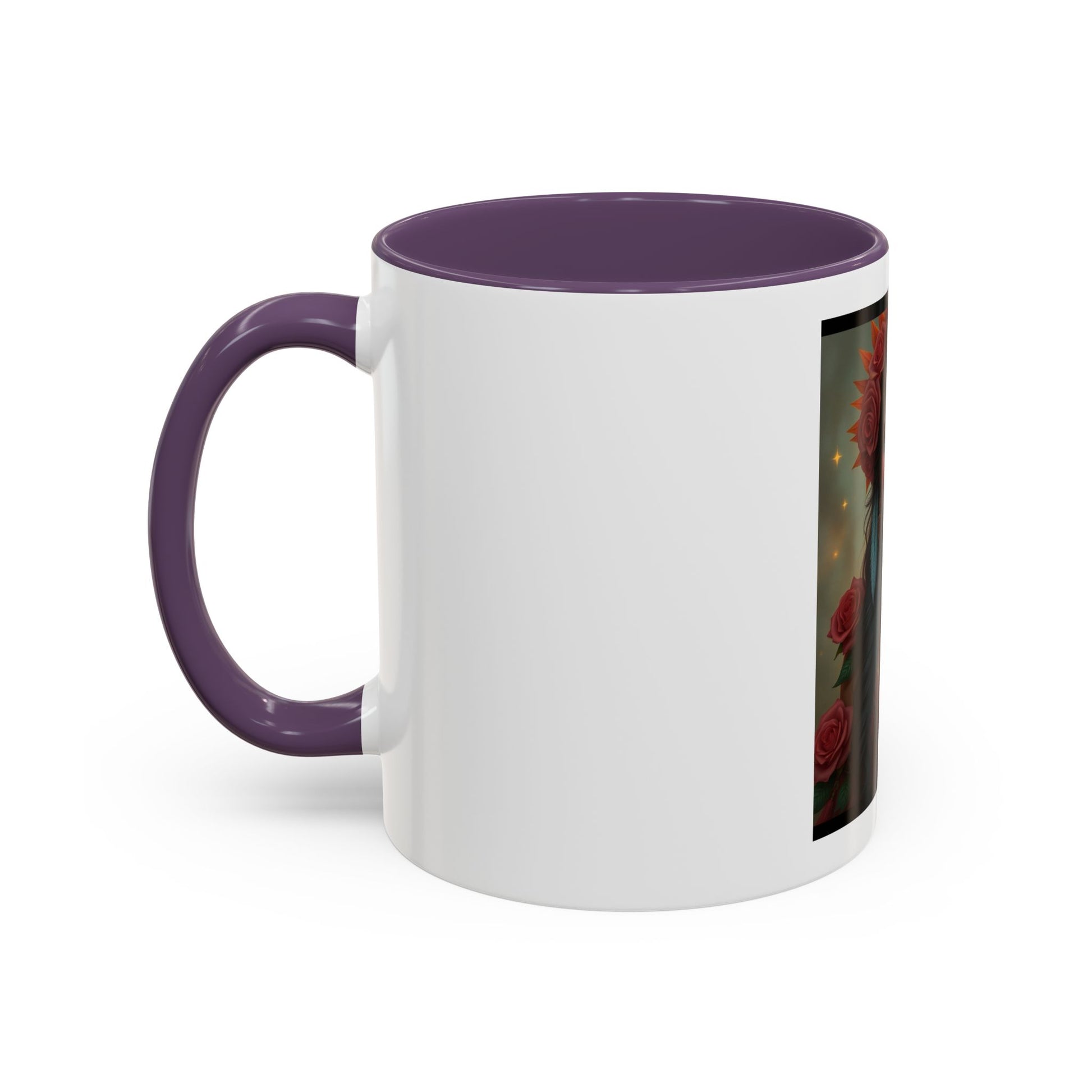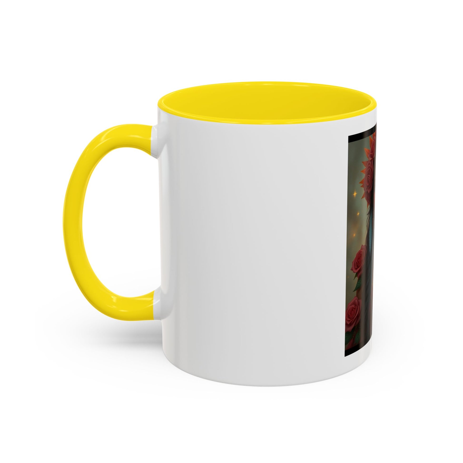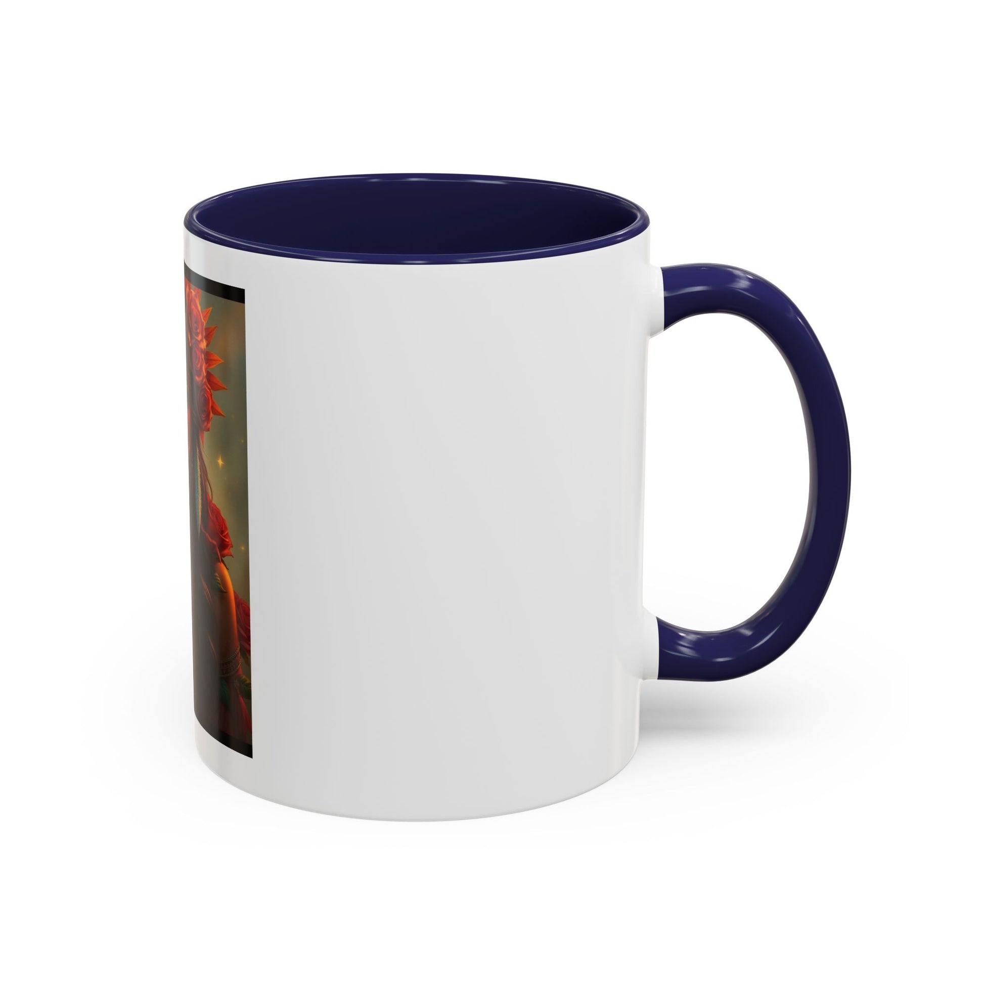 A vivid ceramic mug that feels like holding a tiny altar. The artwork wraps a warm, lantern-lit portrait of a woman crowned with roses and feathers — colors glow against the glossy white body and contrasting black interior and handle. Each sip becomes a quiet, ritual moment: coffee steaming, gold flecks in the print catching the light, and the image inviting a breath of calm and confidence. Built for daily use, it brings a touch of soulful beauty to morning routines, studio breaks, or evenings curled up with a notebook.