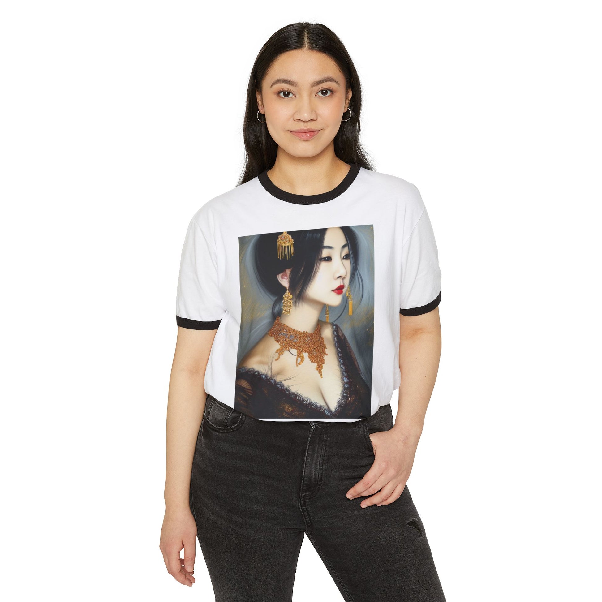 A lightweight ringer tee made to feel like a quiet, stylish staple in your wardrobe. The soft, combed ring-spun cotton body and contrasting collar and sleeve trim give a retro-but-refined look that pairs effortlessly with denim or layered under a jacket. The artwork print—a moody, elegant portrait—adds a touch of artful mystery, letting you wear a story rather than just a logo. Comfortable, breathable, and cut with side seams for lasting shape, this shirt moves with you from slow mornings to late-night meetups while keeping the printed image sharp and central to the look.